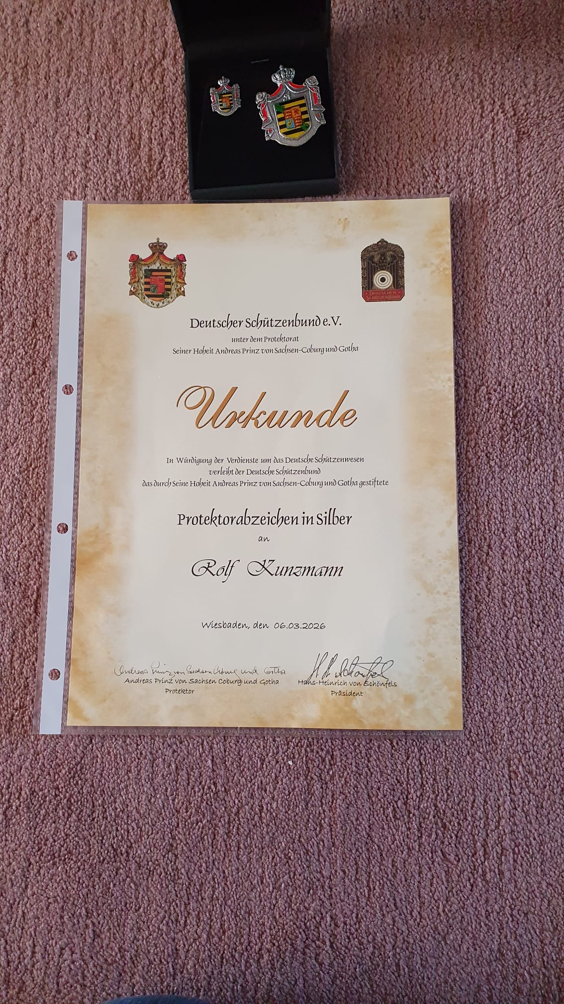 „In Würdigung der Verdienste um das Deutsche Schützenwesen verleiht der Deutsche Schützenbund durch seine Hoheit Andreas Prinz von Sachsen – Coburg und Gotha gestiftete Projektorabzeichen in Silber an Rolf Kunzmann“!